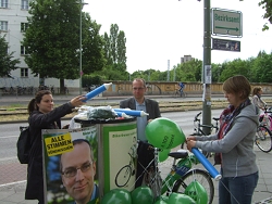 Die traditionelle Sternfahrt des ADFC ist eine politische Veranstaltung, aber irgendwie auch ein Fest. Viele tausend Fahrradbegeisterte fuhren auch dieses Mal wieder durch den Bezirk Pankow Richtung Brandenburger Tor. Der bündnisgrüne Info- und Luftballonstand war wie in den letzten Jahren an der Prenzlauer Allee vor dem S-Bahnhof. Wir haben die Demonstration mit grünen Luftballons verziert, die Nachfrage war groß. Wir hatten uns diesmal entschlossen, auf Heliumgas zu verzichten. Die Ballons wurden mit Luftpumpen oder klassisch mit der eigenen Lunge aufgepustet. Für RadfahrerInnen auch kein Problem. Unter dem Motto "Hilfe zur Selbsthilfe" haben wir die Teilnehmer dadurch zum Mitmachen animiert.