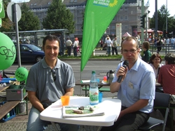 Das Fest an der Panke ist regelmäßig der Höhepunkt der Feiersaison in Pankow, bündnisgrüne Präsenz also unerlässlich. Diesmal waren neben vielen Bürgerinnen und Bürgern auch einige Bundespolitiker an unserem Stand. Renate Künast und Cem Özdemir stellten sich meinen Fragen und denen der versammelten Bürgerschaft. Wir haben über den Euro, Kanzlerin Angela Merkel und die europäische Idee, über Wowereit und den Flughafen sowie die Urwahl des Spitzenteams geredet. Die meisten Bürgerfragen gingen um BER und darum, wie lange Alt-Pankow noch in der Einflugschneise liegt. Angesichts der dröhnenden Starts über der Festmeile eine berechtigte Frage.