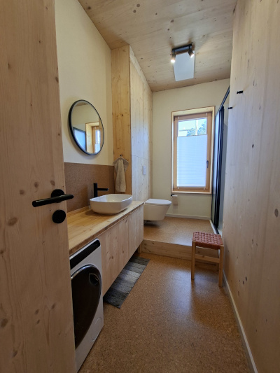 Holzwände und Korkböden auch im Bad. Die Feuchtigkeit reguliert sich durch die Materialien.