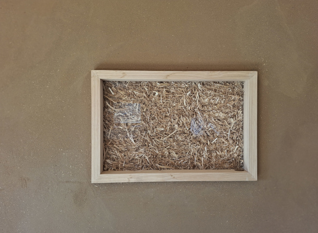 Ein Sichtfenster auf das Stroh hinter dem Lehmputz.