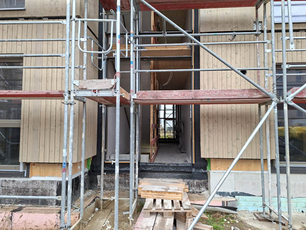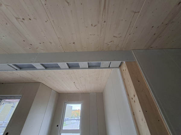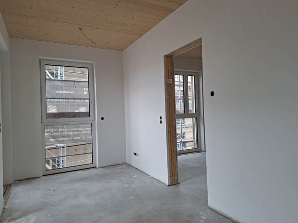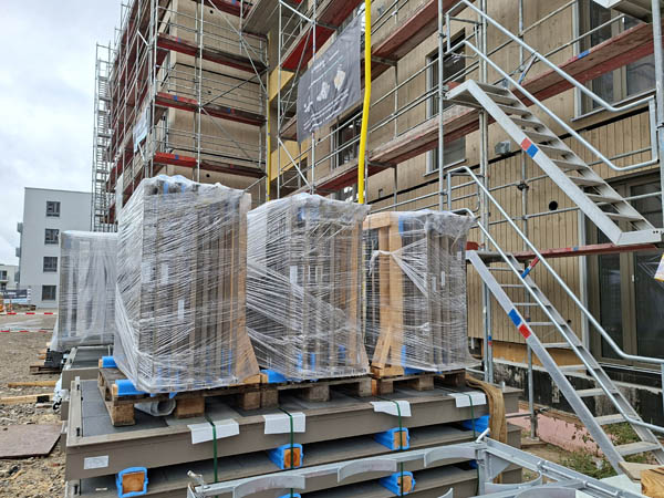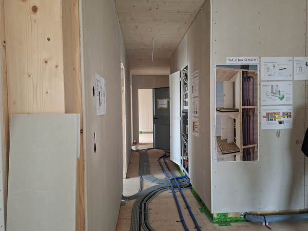 Auf der Baustelle werden fertige Boxen montiert. Diese kommen mit der Bahn und das letzte Stück mit dem LKW. Herzstück sind die Badzellen und die Box mit den technischen Installationen. In der Fabrik wird alles digital geplant und zugeschnitten. Dadurch sinkt der Verschnitt und die Produktion ist extrem abfallarm. Weil jedes Bauteil digital erfasst ist, wird ein Rückbau leicht möglich. Folien zum Beispiel können an den Hersteller zurück gehen. Die Montage erfolgt ohne Klebstoffe.